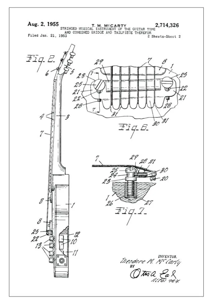 Denne patentplakat viser en opfindelse for et strengeinstrument, specifikt en elguitar, med patent givet den 2. august 1955 under patentnummer 2,714,326. Opfinderen, Theodore M. McCarty, indsendte ansøgningen den 21. januar 1953. Illustrationerne giver detaljerede visninger af instrumentets hals, krop, og hoved, samt et snit, der viser, hvordan strengene er forbundet til både broen og halen på guitaren.