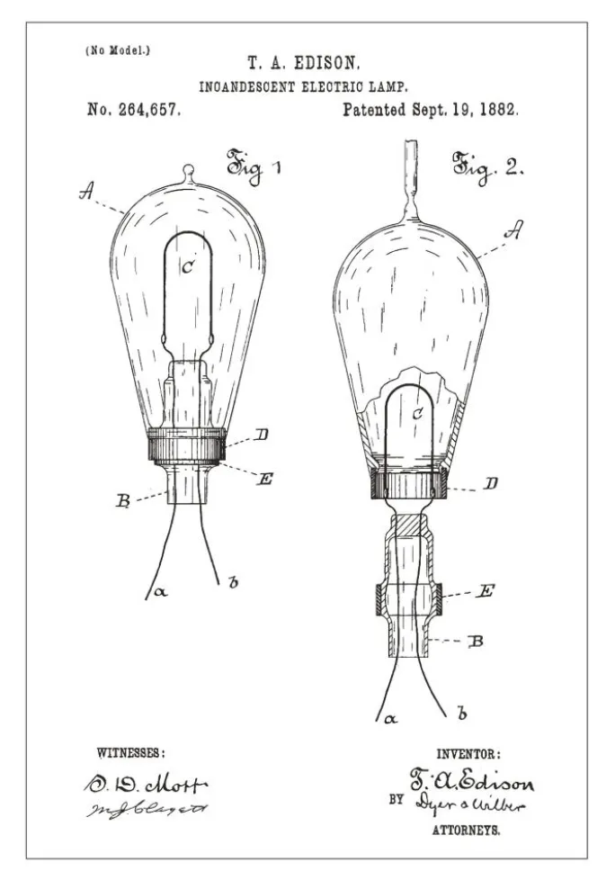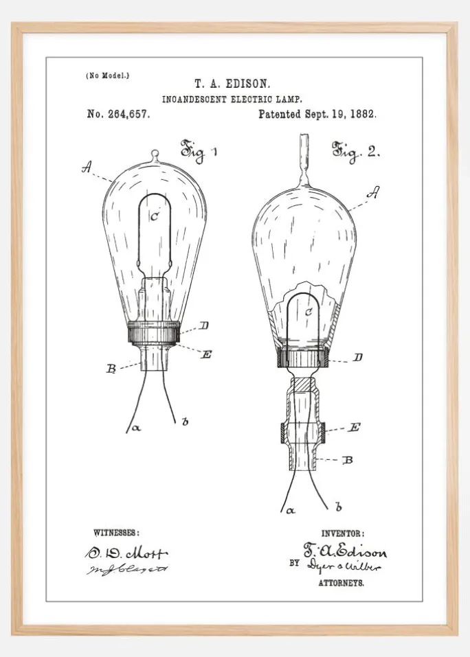 Denne særligt fremstillede patentplakat afslører skønheden i T. A. Edisons design af en glødepære, som formede den moderne verden gennem patentnummer 264,657, bevilget den 19. september 1882. Den detaljerede illustration belyser de tekniske aspekter af en tidlig version af glødepæren, som var en af de første kommercielt succesfulde glødepærer. Denne patentplakat er en perfekt hyldest til en af de mest indflydelsesrige opfindere gennem tiderne og hans bidrag til elektrisk belysning.