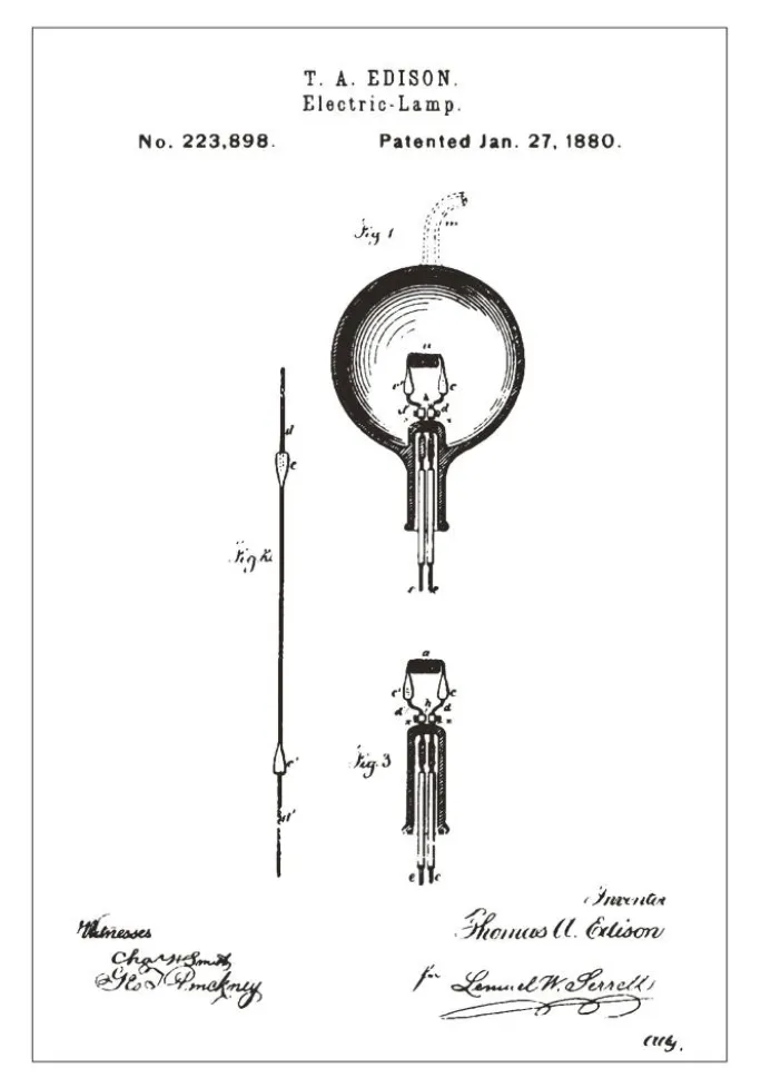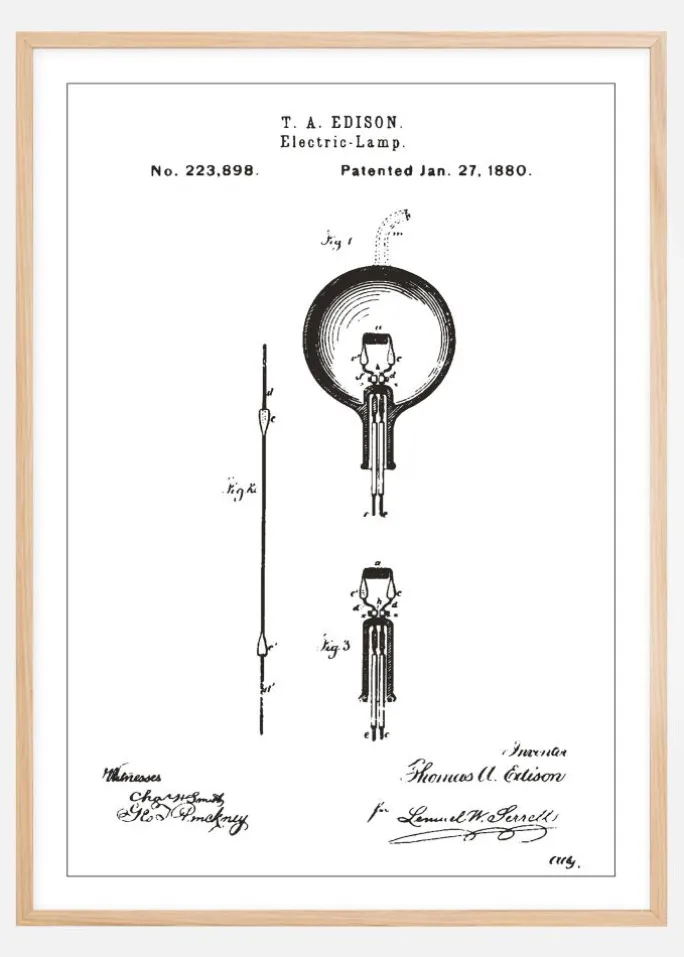 Denne tidløse patentplakat viser Thomas A. Edisons banebrydende elektriske lampe, som har lyst op vores liv, siden den fik patentnummer 223.898 den 27. januar 1880. Denne stilfulde og pædagogiske plakat er en hyldest til en af de største opfindelser gennem tiderne og giver et unikt indblik i teknologisk innovation. Detaljerne i tegningen afslører den omhyggelige proces bag opfindelsen af glødelampen, et produkt der er centralt i vores daglige liv. Denne plakat er en fantastisk samtalestarter og en inspirationskilde, perfekt for alle der værdsætter historisk teknologi og design.