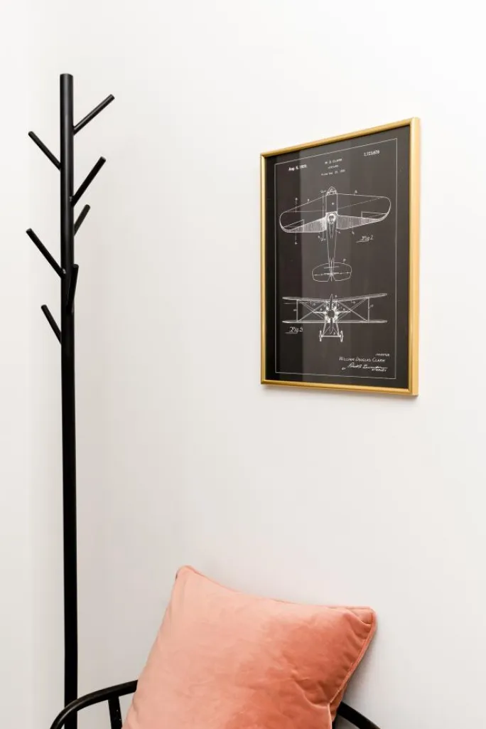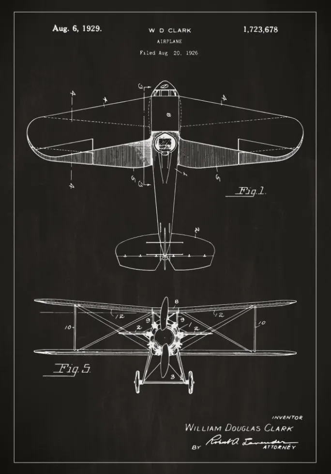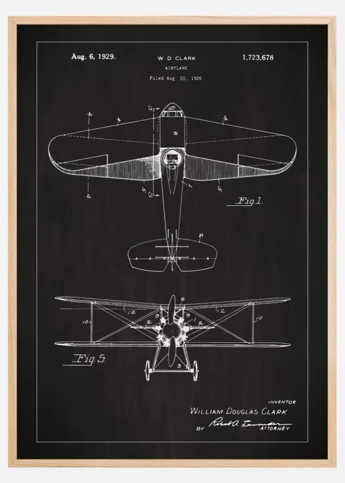 Fra himlen til dit hjem, denne patentplakat afbilder W D Clarks flydesign, en pioneropfindelse som blev tildelt patentnummer 1,723,678 den 6. august 1929. Det er en sand repræsentation af tidens ånd, når luftfartsteknologien gjorde store fremskridt. Denne præcise gengivelse af de originale tegninger er en hyldest til den æra af innovation.