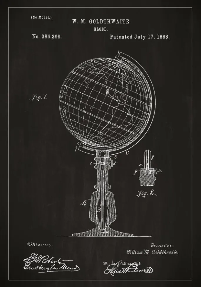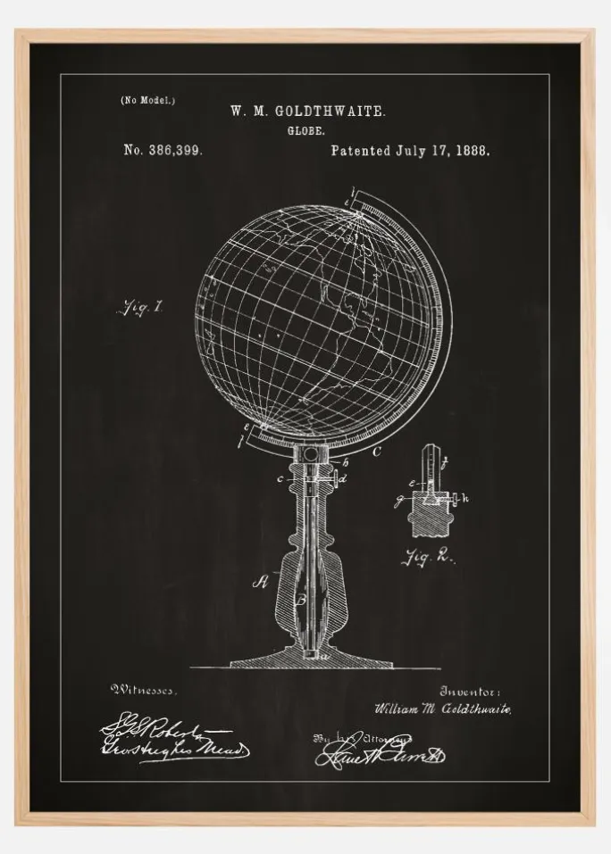 Denne patentplakat fremstiller W. M. Goldthwaite’s design af en klassisk globus, en detaljeret skabelse, der blev foreviget gennem patentnummer 386,399 den 17. juli 1888. Plakaten fanger opfindelsens elegance og funktionelle skønhed og illustrerer verden i to dimensioner på en sådan måde, at det inspirerer til opdagelser og udforskninger. Dens præcise linjer og klarhed i design gør den til et fremragende pædagogisk værktøj og en ønskværdig indretningsdetalje for alle, der værdsætter geografi og verdenshistorie.