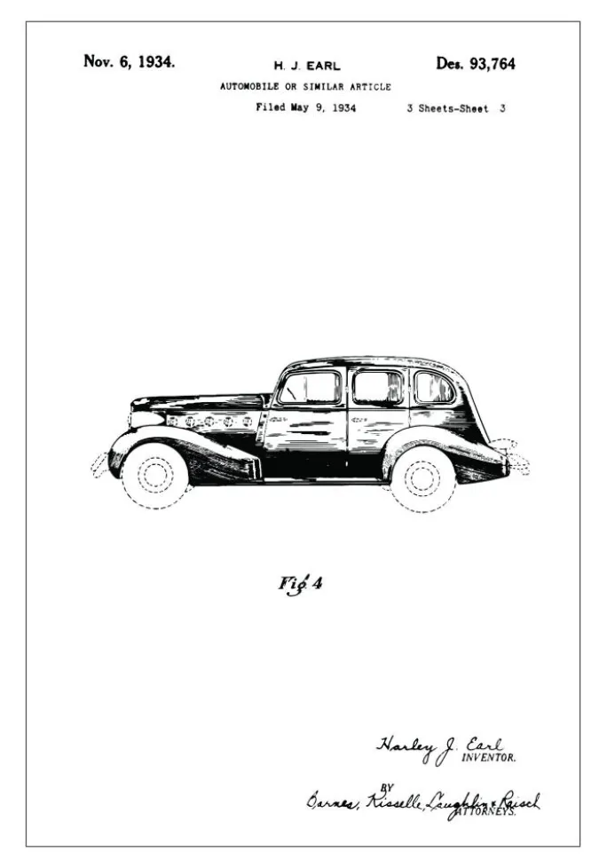 Denne patentplakat afbilder en bil, patenteret af H.J. Earl den 6. november 1934 under patentnummer Des. 93,764. Opfindelsen vedrører en bil eller lignende artikel, som angivet i ansøgningen indgivet den 9. maj 1934. Tegningen viser en sidevisning af køretøjet, hvilket giver en klar opfattelse af dets design og proportioner typiske for den periode.