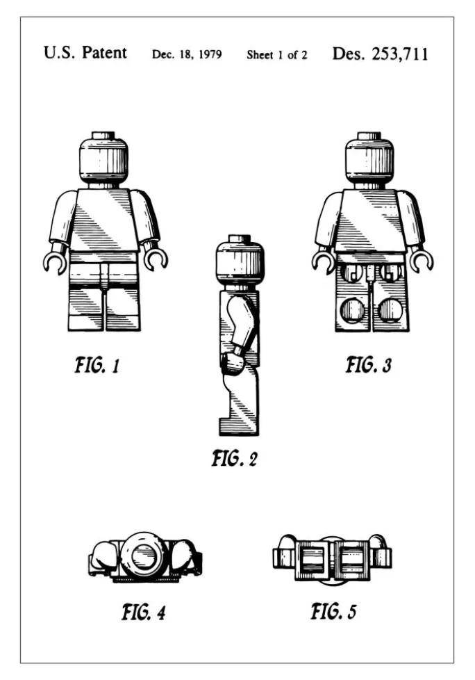 Denne patentplakat præsenterer en klassisk byggbar Lego-figur, hvilket er et tidløst og kreativt legetøj, som har fængslet børns fantasi i generationer. Bevilget den 18. december 1979, under patentnummer Des. 253,711, viser tegningen en byggbar figur i flere visninger, som demonstrerer legetøjets modulære design og fleksibilitet. Det er en enkel, men samtidig genial repræsentation af konceptet med interaktiv og pædagogisk legetøjsleg.