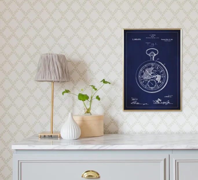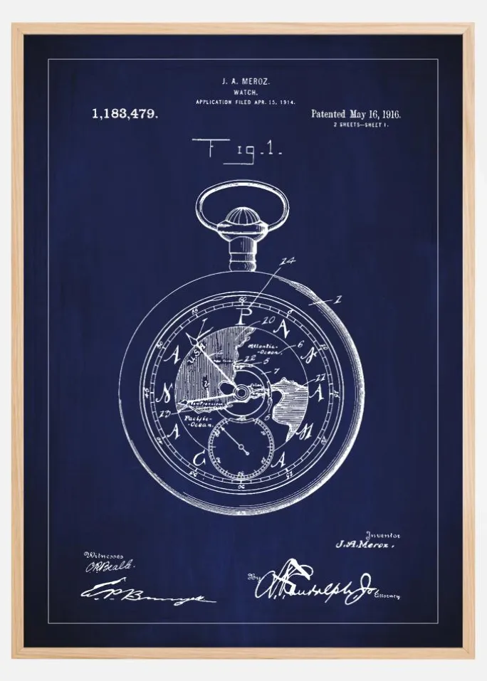 Udforsk historiens opfindsomhed med vores eksklusive patentplakat, der skildrer en klassisk tidsmåler. Denne autentiske patenttegning, oprindeligt indgivet den 15. april 1914 og tildelt patentnummer 1.183.479 den 16. maj 1916, fremhæver den tidløse innovation af J.A. Meroz. Dens omhyggelige detaljer og tekniske skitser giver et unikt indblik i armbåndsurets tidlige udvikling. Denne patentplakat kombinerer industrihistorie med elegant design og bliver en perfekt samtalestarter for alle, der sætter pris på mekanisk design og historiske dokumenter.
