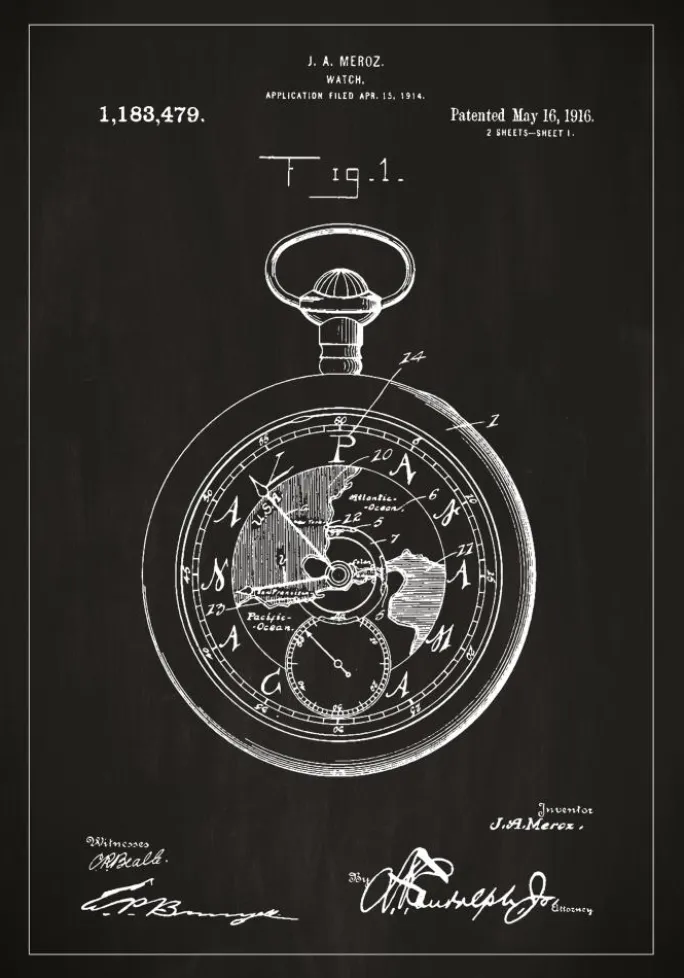 Denne sofistikerede patentplakat afbilder den tidløse opfindelse af et lommeur, patenteret af J.A. Meroz den 16. maj 1916, under patentnummer 1.183.479. Den detaljerede patenttegning viser et indviklet design af urværket, komplet med mekaniske detaljer, der afspejler den æra, hvor præcisionen i tidsmåling blev en kunstart i sig selv.