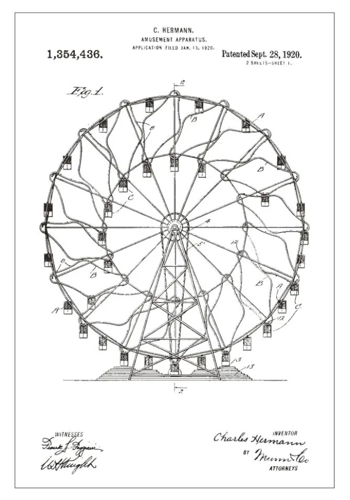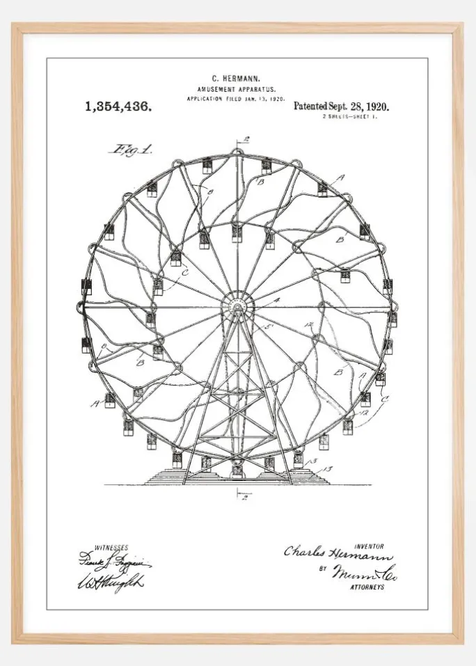 Denne patentplakat viser C. Hermanns opfindelse, en fornøjelsesmaskine designet til glæde og spænding, tildelt under patentnummer 1,354,436 den 28. september 1920. Designet repræsenterer det klassiske og elskede pariserhjul, et symbol på forlystelsesparker verden over. Denne omhyggelige tekniske tegning fanger strukturens kompleksitet og er en hyldest til forlystelsesindustriens tidlige dage.