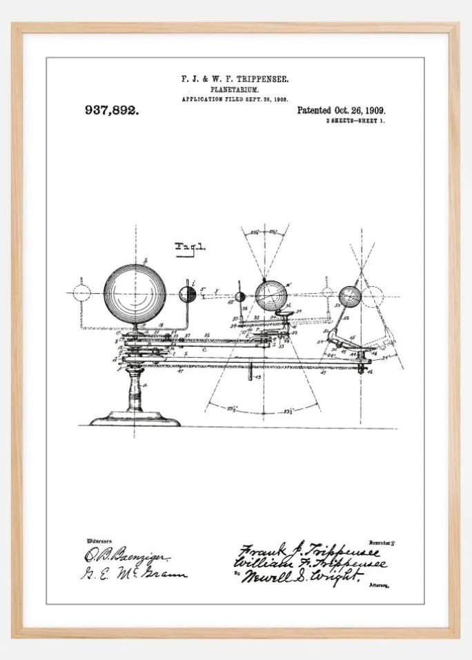 Denne elegante patentplakat er en hyldest til ingeniørkunsten og studiet af himmellegemer, med en detaljeret gengivelse af F. J. & W. F. Trippensees planetarium, en klassisk opfindelse fra tidligt 1900-tal. Patentet, nummer 937.892, blev registreret den 26. oktober 1909, og ansøgningen blev indgivet den 28. september 1908. Dette kunstnerisk gengivne patentdokument er en unik indretningsdetalje, der tilbyder både en historielektion og en samtalestarter. Den er ideel for den videnskabsinteresserede eller for at give en akademisk følelse i hjemmet, kontoret eller klasseværelset.