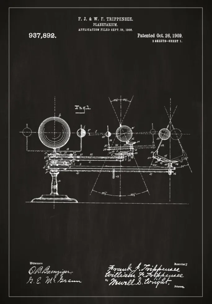 Den nøje udformede patentplakat præsenterer et planetarium, et instrument som banede vejen for studiet af himmellegemernes bevægelser. Patenttegningen viser F. J. & W. F. Trippensee’s design, som blev tildelt patentnummer 937,892 den 26. oktober 1909, efter ansøgning den 28. september 1908. Hver detalje og komponent i konstruktionen er smukt gengivet, hvilket afslører kompleksiteten og præcisionen af dette undervisningshjælpemiddel for astronomi. Det er et fængslende og inspirerende billede for alle med en passion for stjernehimlen og de pædagogiske værktøjer, der er blevet brugt til at udforske den.