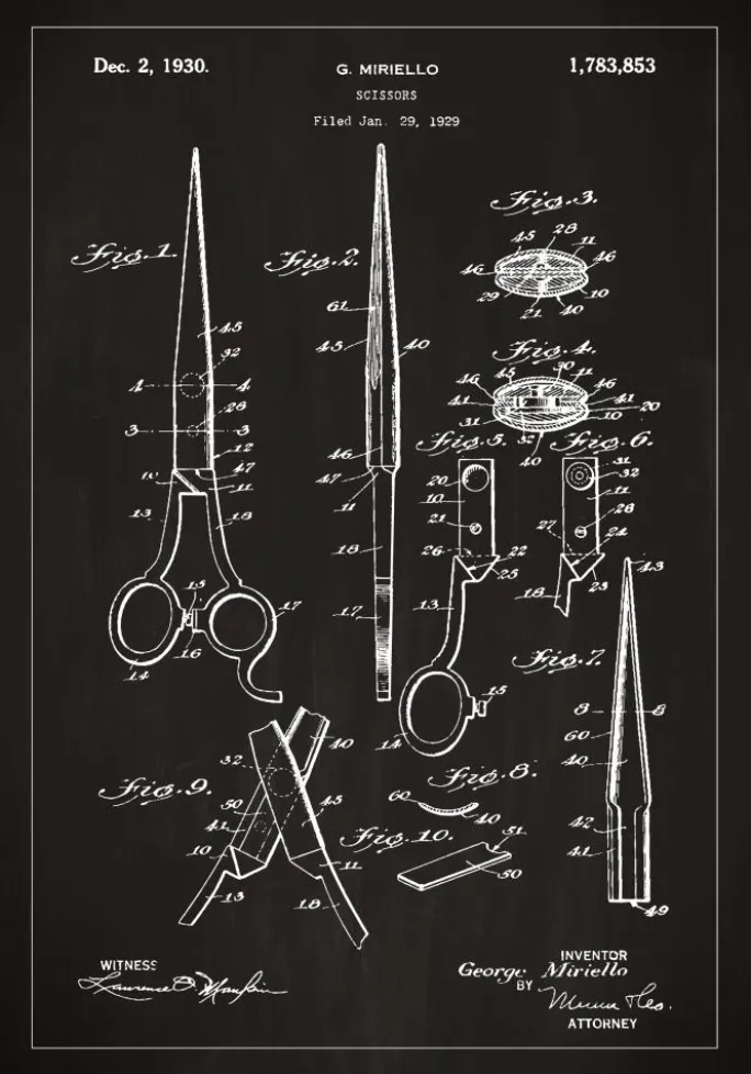 Denne distinkte patentplakat er en hyldest til et klassisk designikon – saksen. Den afbilder G. Mirellos patent, som blev udstedt den 2. december 1930 med patentnummer 1.783.853, efter at være blevet indgivet den 29. januar 1929. Med omhyggelige skitser, der viser forskellige vinkler og dele af saksen, fra de spidse blade til de ergonomisk udformede håndtag, fanger denne patenttegning selve essensen af håndværk og design.
