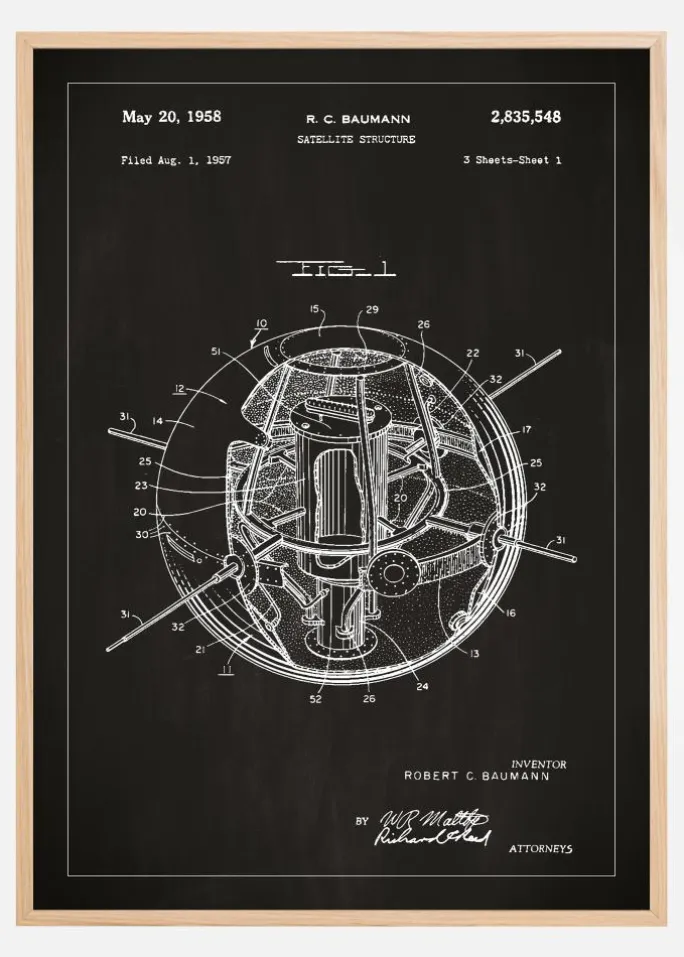 Denne fremtrædende patentplakat afbilder en banebrydende konstruktion i rumteknologiens morgen: R.C. Baumanns “Satellite Structure”, patenteret den 20. maj 1958, med patentnummer 2,835,548. Indsendt den 1. august 1957, viser denne detaljerede patentegradering en tidlig model af en kunstig satellit, komplet med dens komponenter og unikke geometriske konfigurationer, hvilket afslører den innovative ånd under rumkapløbets æra.