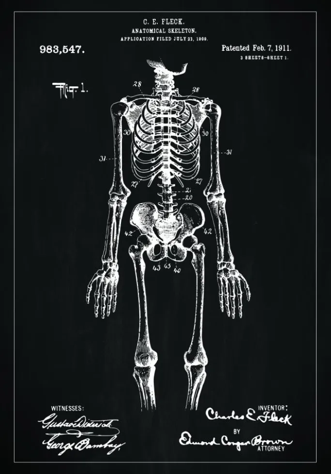 Denne fascinerende patentplakat fremviser patentnummer 983.547, givet til C. E. Fleck den 7. februar 1911, for en anatomisk korrekt model af et skelet. Hvert ben og struktur er dygtigt indgraveret med hvide linjer mod en slående sort baggrund, hvilket resulterer i en visuel oplevelse, der er både pædagogisk og kunstnerisk. Det er en spektakulær illustration, der demonstrerer menneskekroppens vidundere og kompleksitet.