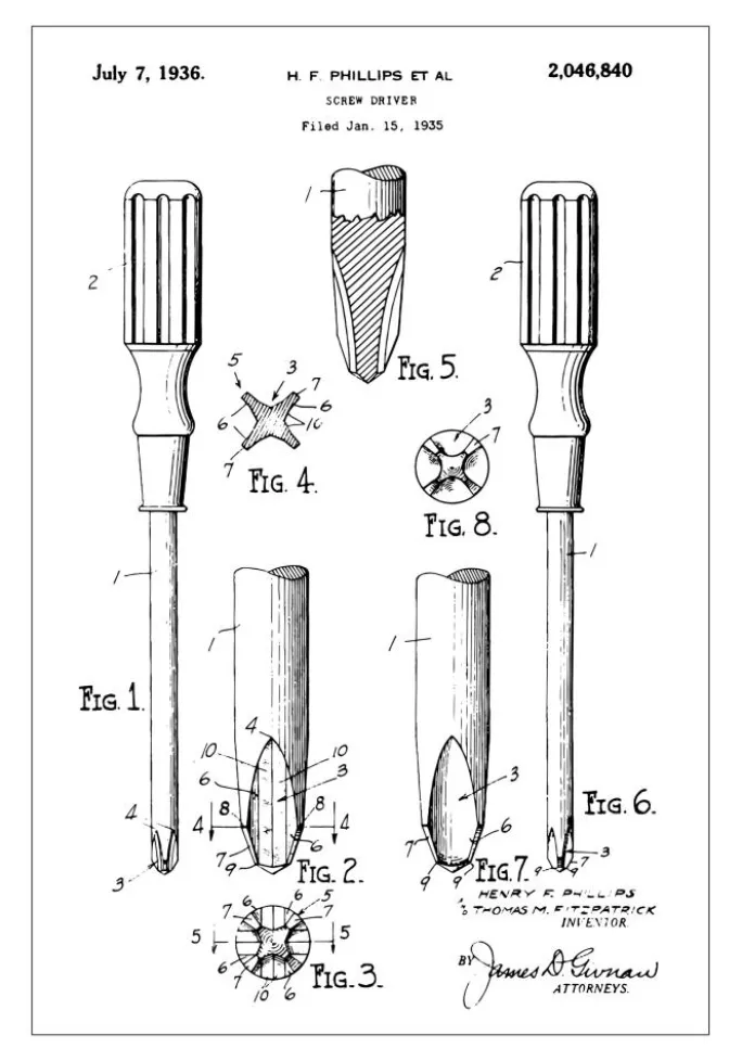 Præsenteret her er en klassisk patentplakat, der skildrer designet af en skruetrækker, en uundværlig værktøjsklassiker i enhver håndværkers værktøjskasse. Dateret den 7. juli 1936 og arkiveret den 15. januar 1935, viser denne patentplakat med nøje detaljer konstruktionen og innovationen bag værktøjet, fra dets ikoniske håndtag til spidsens unikke form. Opfinderne H.F. Phillips og andre har med dette patent, nummer 2,046,840, skabt en standard inden for værktøjsindustrien, som vi stadig stoler på i dag.