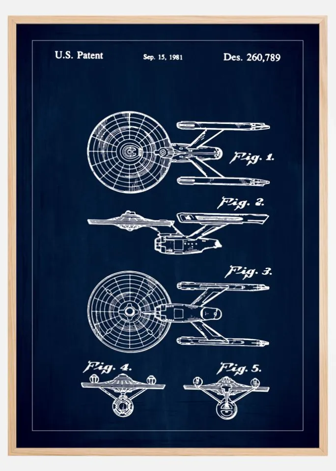 Denne patentplakat gengiver designen af rumfartøjet Enterprise fra Star Trek, med patentnummer Des. 260,789 dateret den 15. september 1981. Den detaljerede patenttegning er et eksempel på tidlig sci-fi-inspireret innovation, en vision om fremtidig udforskning af kosmos. Illustrationerne viser fartøjet fra forskellige vinkler og positioner, hvilket giver en dyb forståelse for dets unikke og komplekse struktur. Patentplakaten er et udtryk for menneskehedens stræben efter at nå stjernerne og en perfekt dekoration for alle, der drømmer om interstellære eventyr.
