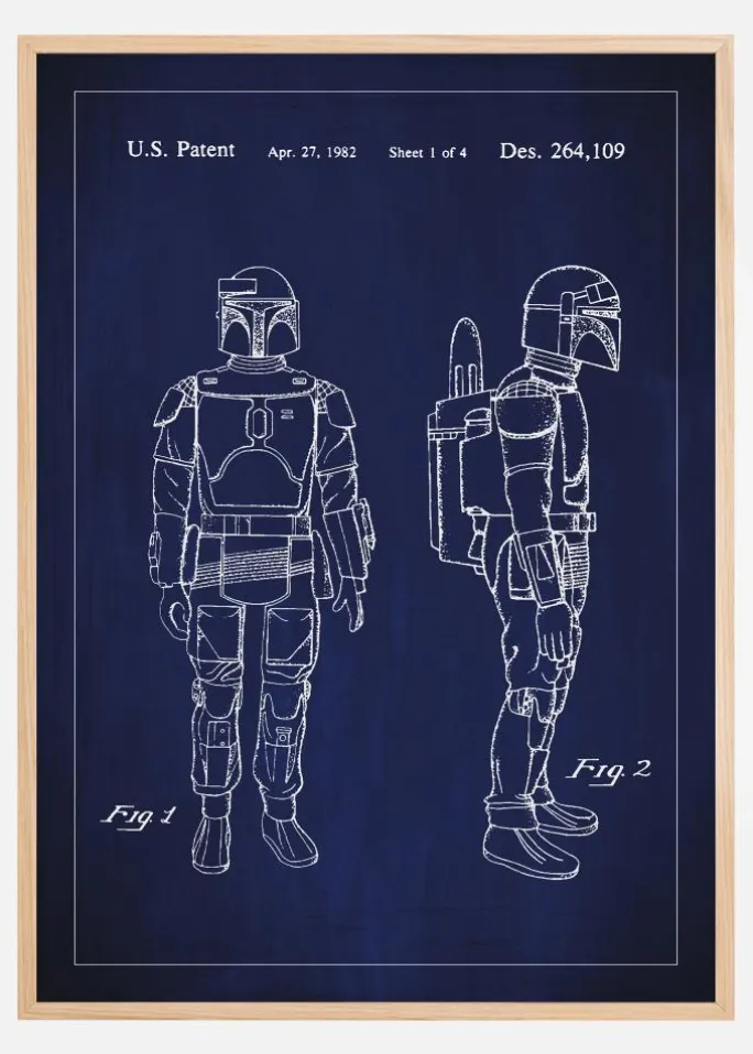 Denne elegante patentplakat er en hyldest til innovation og den utrættelige menneskelige kreativitet. Med en patenttegning dateret den 27. april 1982 viser Des. 264,109 en rustningsdragt til Boba Fett fra Star Wars, hvis design både er funktionelt og fascinerende. Denne plakat er perfekt for alle, der sætter pris på en blanding af videnskab og kunst, og tilbyder et unikt indblik i den industrielle designproces.