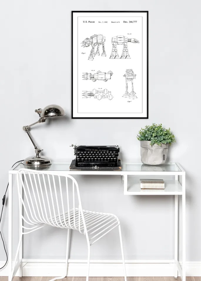 Denne elegante patentplakat er en kreativ gengivelse af designpatent Des. 266.777, registreret den 2. november 1982. Den viser nøjagtige stregtegninger af en ATAT fra Star Wars og giver hver betragter en dybere forståelse for kompleksiteten og præcisionen bag denne tekniske bedrift. Disse patenttegninger er ikke kun intellektuelt stimulerende, men også stilfulde kunstværker, der tilføjer en industriel charme til hvert rum.