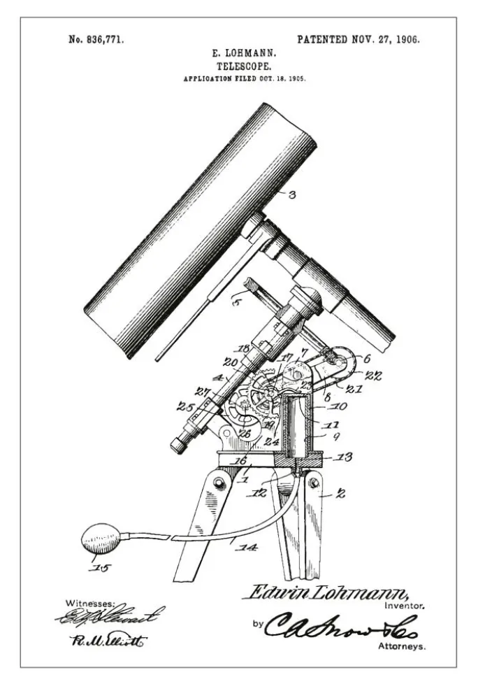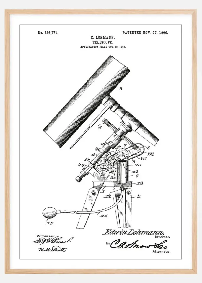Denne patentplakat illustrerer et mesterligt design af et teleskop, en opfindelse af E. Lohmann patenteret den 27. november 1906 under nummer 836,771. Detaljerigdommen i tegningen fremhæver de tekniske komponenter og den mekaniske kompleksitet i dette optiske instrument. Den sort-hvide illustration mod den sorte baggrund tilbyder en stærk visuel kontrast, der forhøjer den tekniske elegance i Lohmanns design og gør den til en eftertragtet indretningsdetalje for alle videnskabs- og astronomiinteresserede.