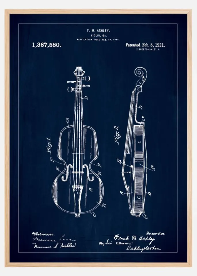 Dette dristige og distinkte patentplakat er en skildring af patent nummer 1.367.580, givet den 8. februar 1921 til F. M. Ashley for en violin, som præsenteres mod en sofistikeret marineblå baggrund. Med sine hvidlinjede illustrationer, der træder frem mod den mørke tone, tilbyder den en kontrast, der fanger øjet og fremhæver hver detalje af dette strengeinstrument, fra scrollen til strengeholderen.