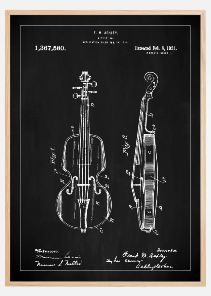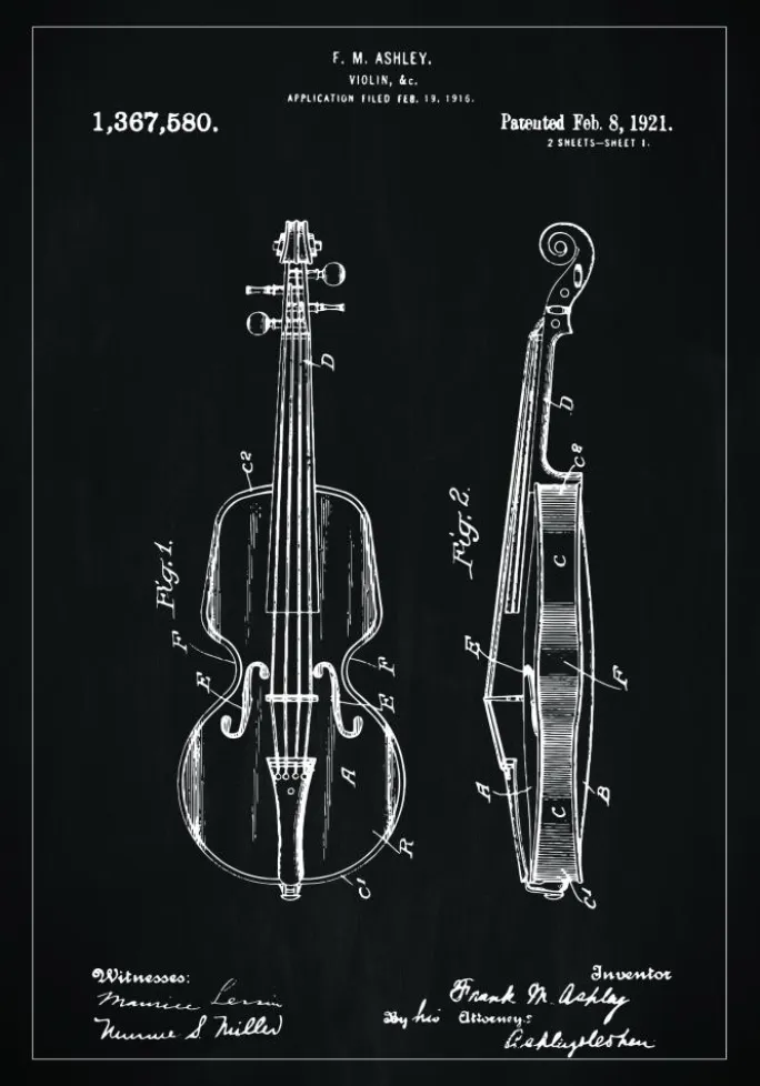 Denne eksklusive patentplakat præsenterer de detaljerede illustrationer fra patentet med nummer 1,367,580, udstedt den 8. februar 1921 til F. M. Ashley for en violin. Den omhyggeligt udformede tegning skildrer instrumentets elegance og kompleksitet, fra den velformede krop til de fine detaljer i strengholderen og stolen. Sort-hvid kontrast mod den sorte baggrund giver en dramatisk og moderne følelse, hvilket fremhæver hver linje og kurve på dette klassiske musikinstrument.
