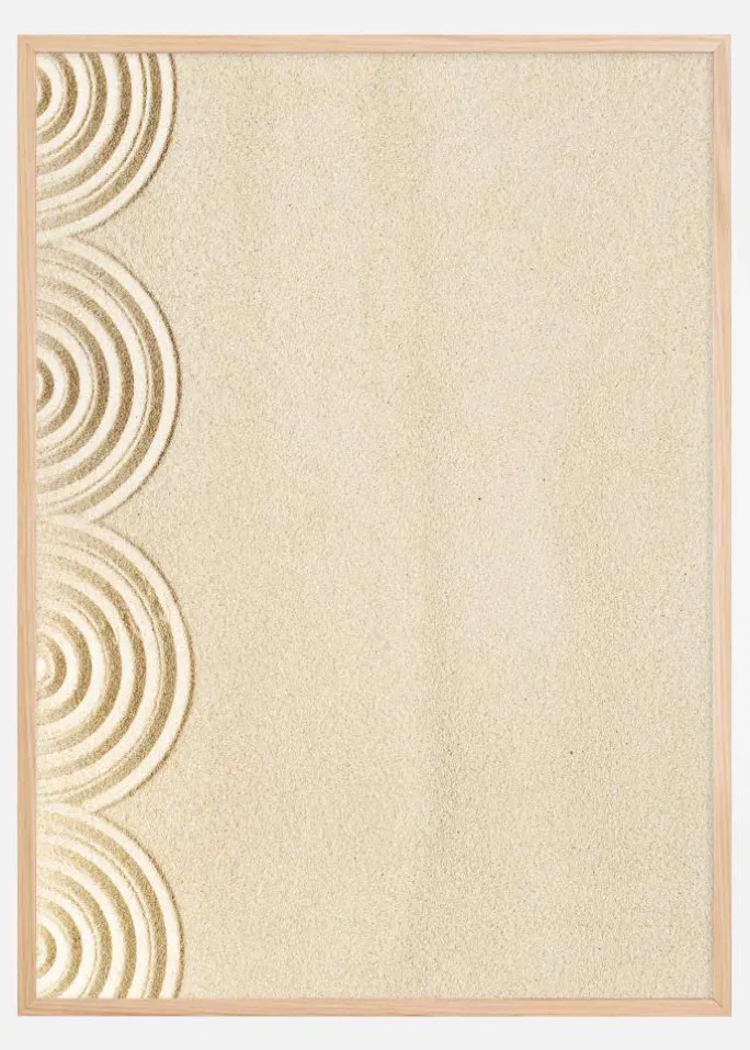 Denne stilfulde og afslappende plakat afbilder kunstneriske mønstre skabt i sand, som skaber en følelse af zen og ro. Den bløde sandfarvede baggrund giver en næsten meditativ tomhed, mens mønstrene til venstre fanger blikket med sine organiske, svajende linjer og koncentriske cirkelformer. Dette minimalistiske kunstværk er en hyldest til de enkle skønheder i naturen og de subtile kunstværker, der kan skabes med blot et par penselstrøg eller fingre.