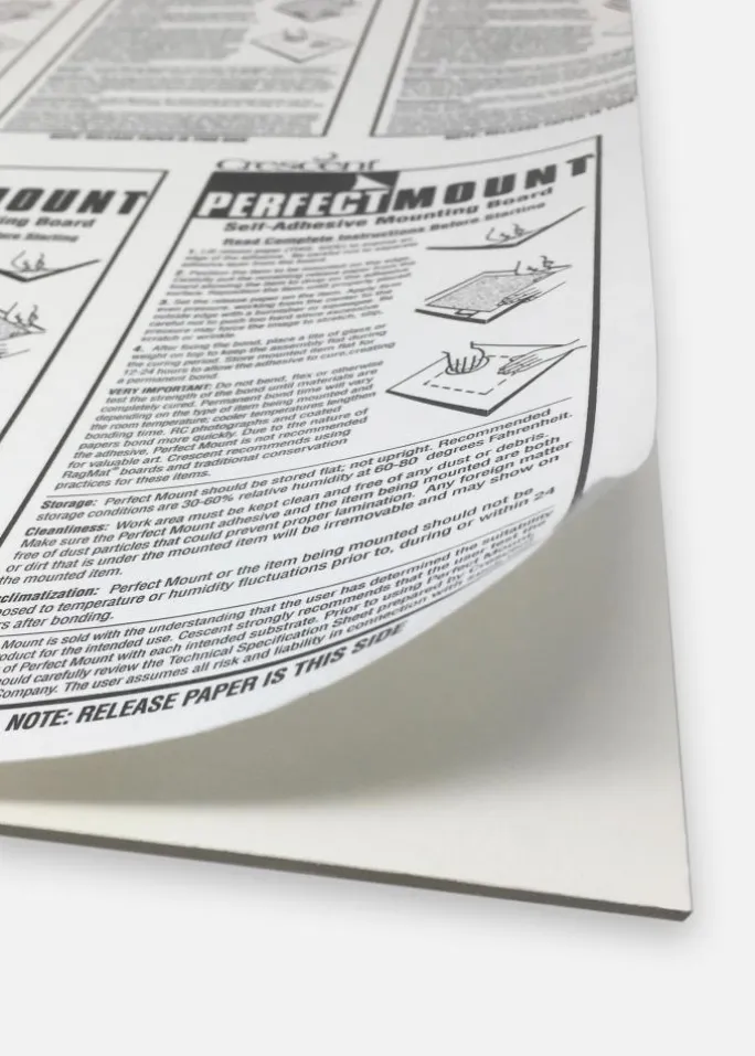 Perfect Mount er en 1,4 millimeters tyk monteringsplade med dobbelhæftende lim til montering af billeder og fotografier. Pladen er selvfølgelig syrefri og PH-neutral for bedst mulig bevaring af dine billeder. Limet på pladen er trykaktiveret, hvilket indebærer at du kan sætte dit billede på og tage det af til du er helt tilfreds. For at få eventuelle bobbler væk, man kan stryge hen over billedets overflade fra midten og ud med en blød klud eller bomuldshandske. Pladen lægges derefter under tryk for at fasteholde billedet permanent.