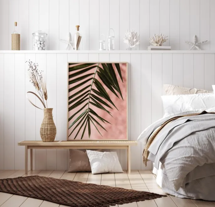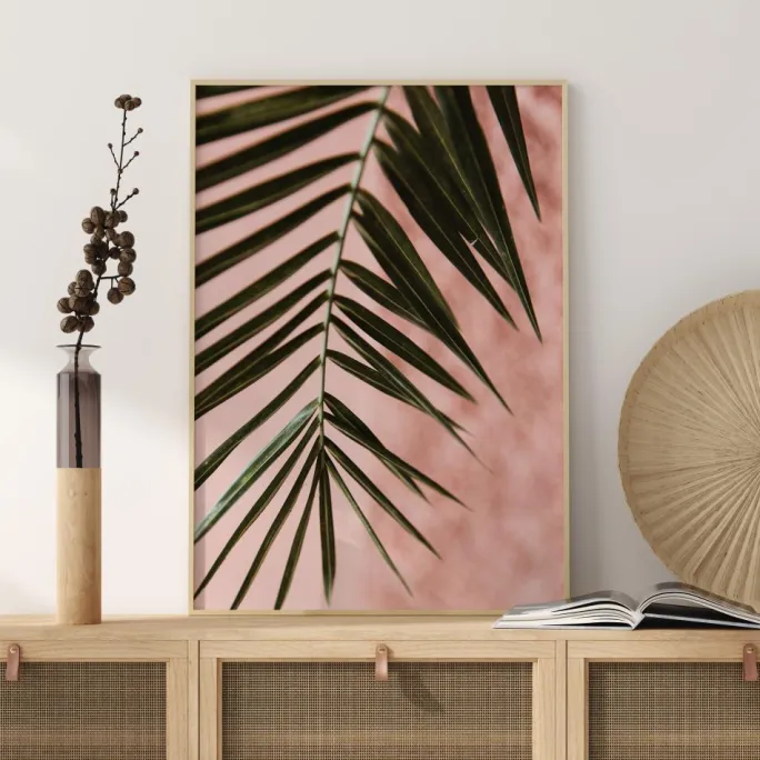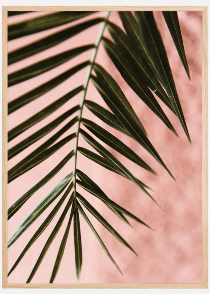 Et smukt nærbillede af et grønt palmeblad. På en lyserød baggrund lyser det grønne blad op i sollysets varme. Forestil dig, at du sidder under en smuk palme, når du hænger dette print op i dit hjem.