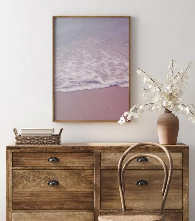 Et fantastisk portræt af havets kyst. Når bølgerne brydes på stranden, dannes der et hvidt skum på sandet. Det smukke lyserøde sand og havet skaber en sommerlig atmosfære. Bring sommeren ind i dit hjem med dette forfriskende print.