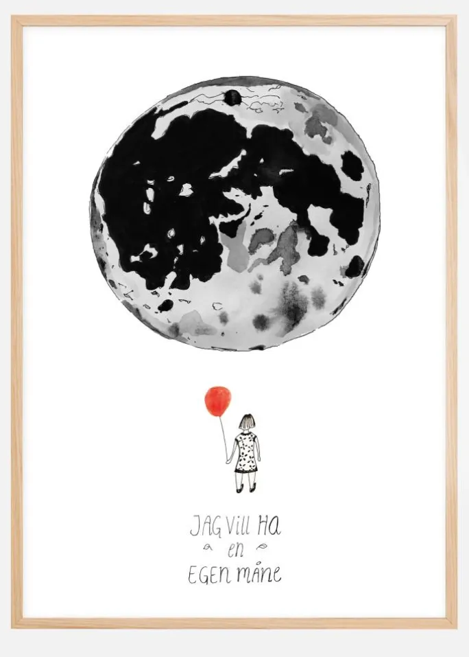 Et simpelt sort-hvidt print af en lille pige, der står under verden. Hun er klædt i en sort og hvidplettet kjole og holder en orange ballon. Jeg vil have min egen måne er det budskab, hun ønsker at formidle. Et perfekt print til at hænge på ethvert børneværelse.