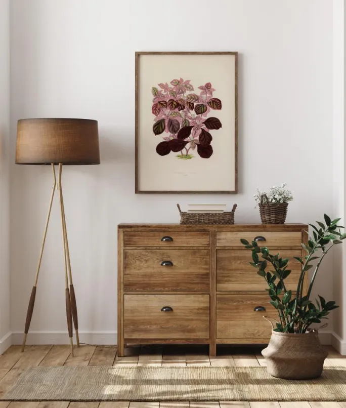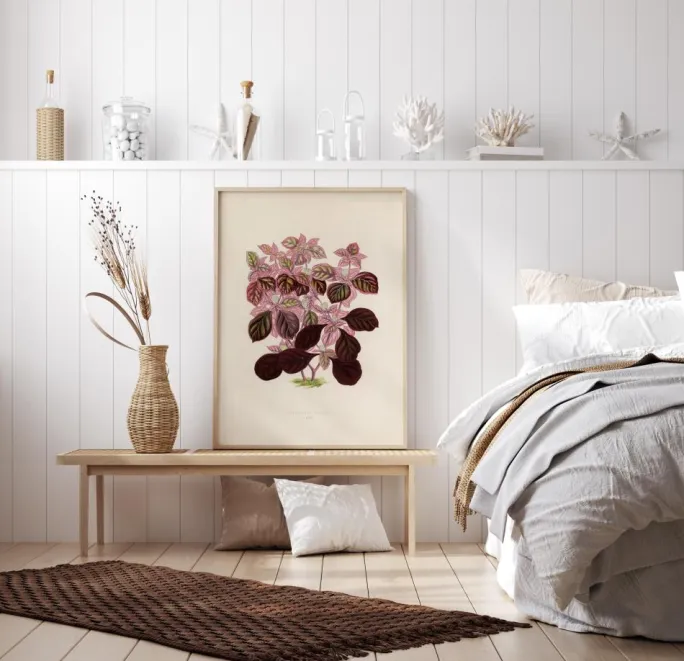 Et smukt håndaftryk af to lyserøde plectranthus scutellarioides. Den bløde beigefarvede baggrund fremhæver de smukke nuancer af rosa og grønt. Mod roden af planten skaber de bordeauxrøde farver en fornemmelse af vort på aftrykket. Tilføj dette print til din kunstsamling derhjemme.