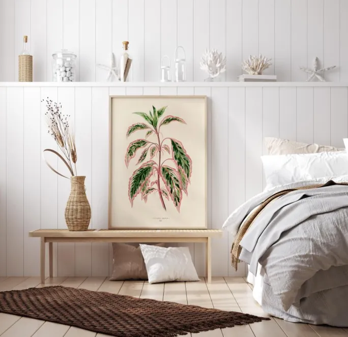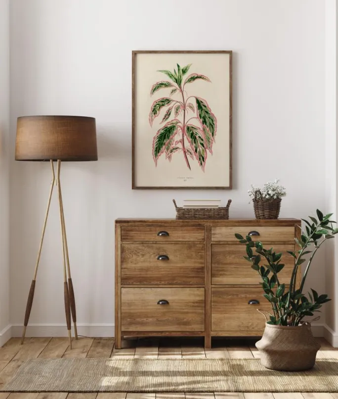 Et delikat print af en plectranthus scutellarioides. Den bløde beigefarvede baggrund fremhæver de smukke lyserøde og grønne blade. Med sine blødt tonede blade giver denne hængende plante en følelse af ro. En perfekt gave til alle, der elsker planter.
