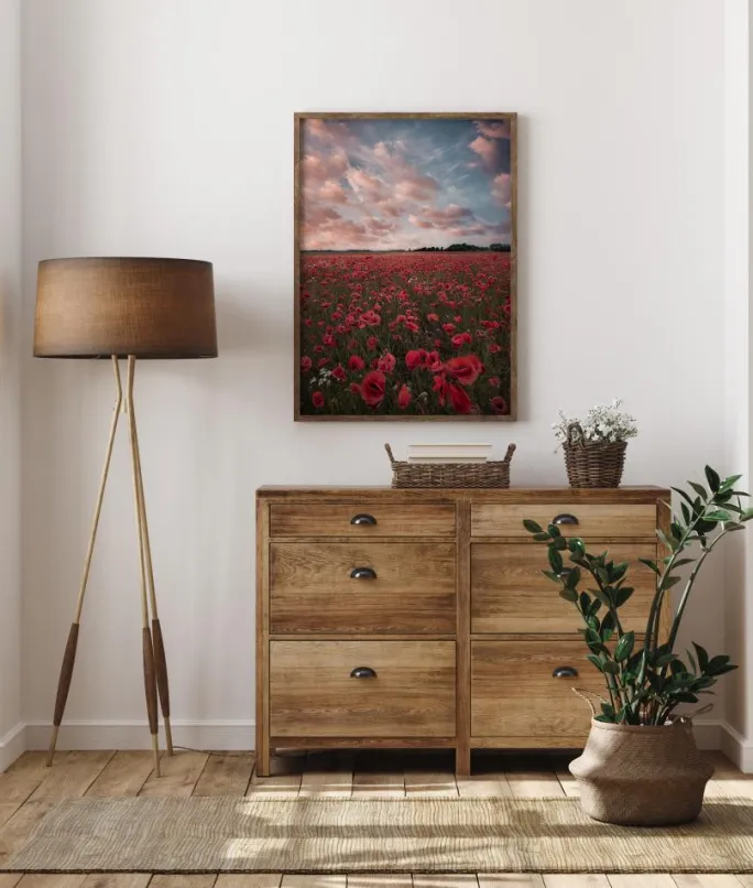 Et fantastisk rødt print af en valmueplads. Den skyede røde himmel fremhæver de smukke røde valmuer og hvide tusindfryd, der vokser vildt på den åbne mark. Den blide vind fejer hen over himlen og blæser valmuebladene. Et helt fantastisk print til at hænge i dit hjem.