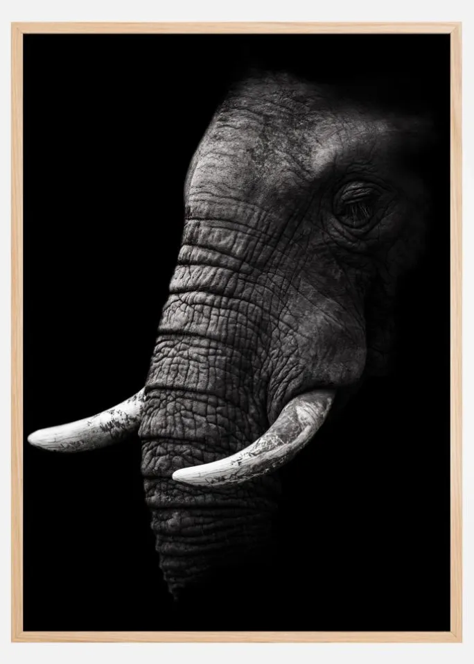 Et fantastisk sort-hvidt print af et elefanthoved. Den sorte baggrund fremhæver de små elefantstødtænder. Med sin lille rynkede snabel og lukkede øjne er billedet en ren repræsentation af elefantens skønhed. Et ideelt print til dyreelskere.