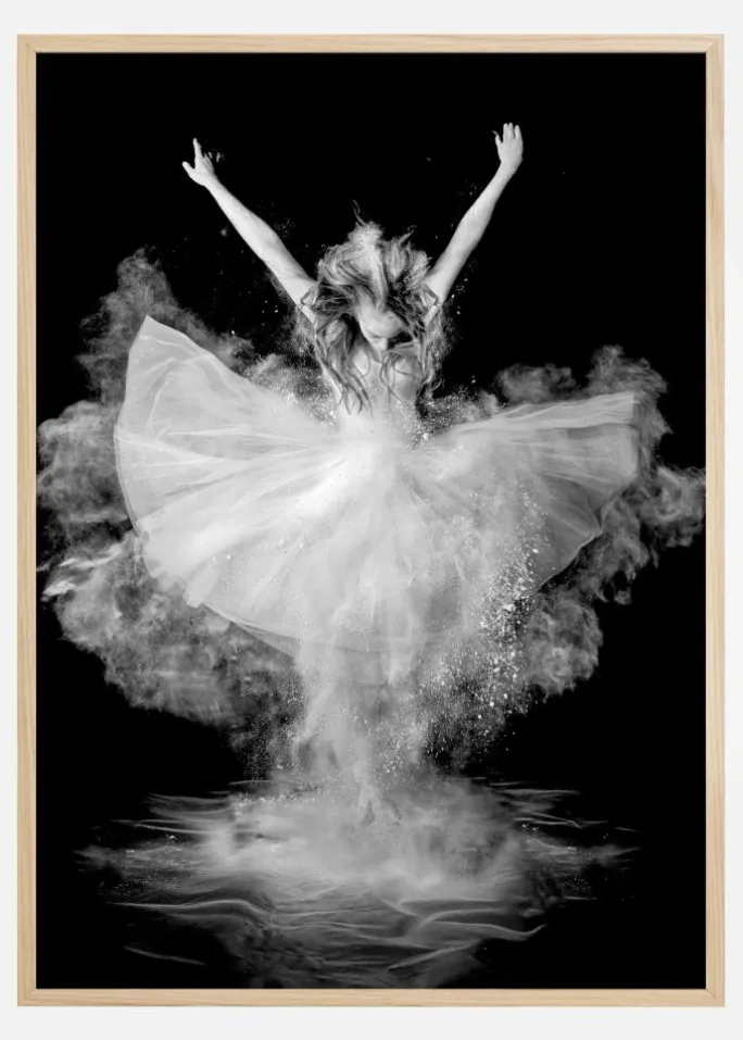 Et storslået sort/hvid billede af en danser. På en sort baggrund ser det ud til, at danseren optræder på vand. Med sin hvide balletkjole spredt ud, falder hvidt støv ned fra kjolen og reflekterer smukt i vandet. Et pragtfuldt print til at hænge i dit hjem.