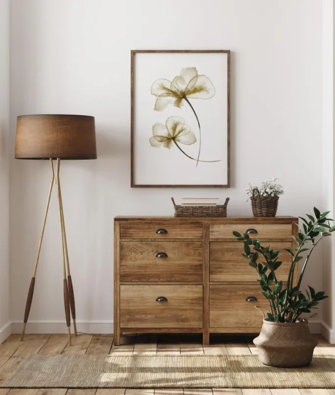 En enkel, men elegant plakat med to hvide blomster på en hvid baggrund. Mod bunden af printet overlapper blomsterstænglerne smukt hinanden, hvilket giver printet et delikat touch. Gennemsigtigheden af de bløde brune og beige toner ville se perfekt ud på en cremefarvet væg.