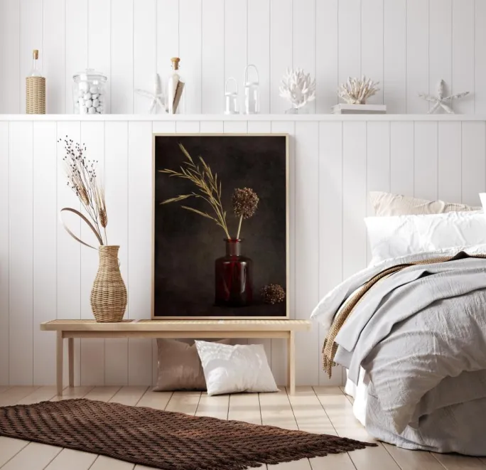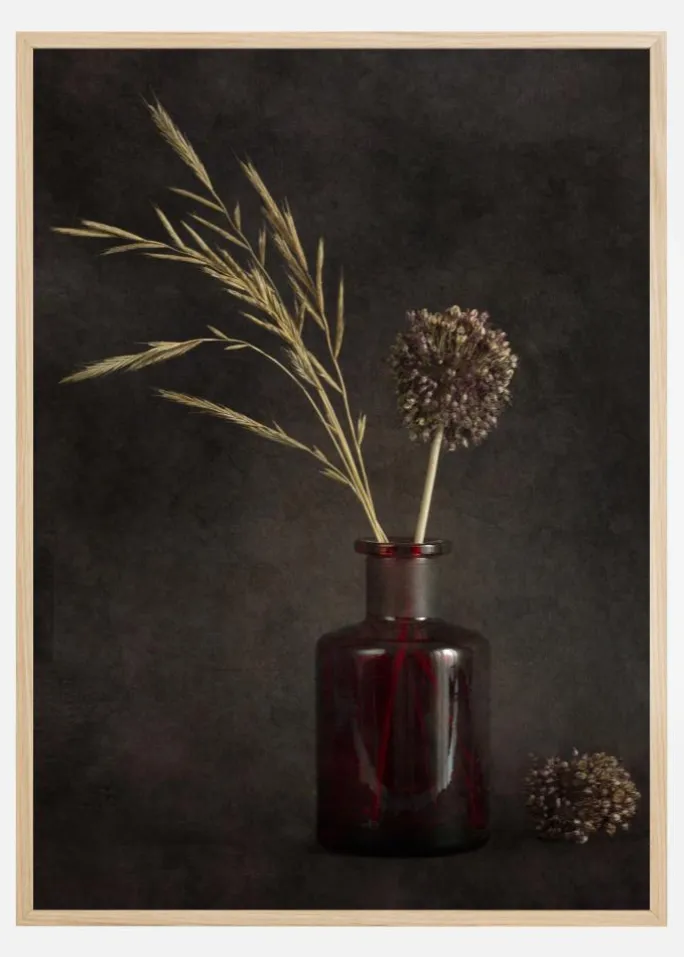 Et smukt men enkelt print af to tørrede græsser i en glaskrukke. På en mørkebrun baggrund er de gule græsser placeret i en rød glaskrukke. Til højre for krukken ligger et tørret græs ved siden af krukken. Et smukt print til at tilføje lidt farve til en hvid væg.