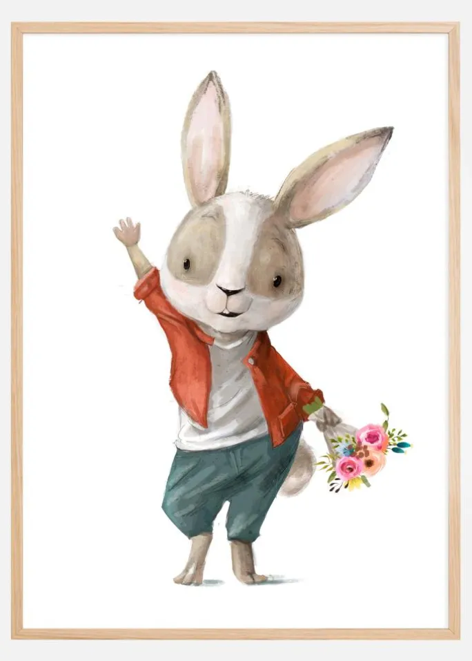 Denne charmerende og livlige plakat forestiller en velklædt kanin på vej, måske til en date, med en buket blomster i hånden. Kaninens varme smil og entusiastiske vinkning giver en følelse af glæde og forventning. Illustrationen, lavet i akvarel, bruger en legende blanding af farver og penselstrøg for at give liv til kaninens personlighed og bevægelse.