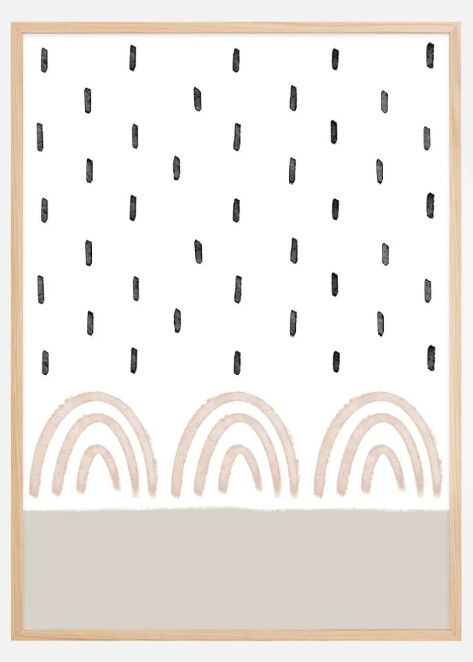 Denne kunstneriske plakat, “Rain on Rainbows”, kombinerer legende og minimalisme på en unik måde. Motivet præsenterer en baggrund med vandfarvede regnbuer i milde nuancer af terrakotta mod en ren hvid base. Over disse bløde buer ses en samling af abstrakte, penselstrøg der ligner regn, svævende i en uordentlig symmetri. Farverne i regnbuerne kontrasterer smukt mod de tuschsorte “regndråber”, hvilket skaber et dynamisk, men alligevel harmonisk billede.