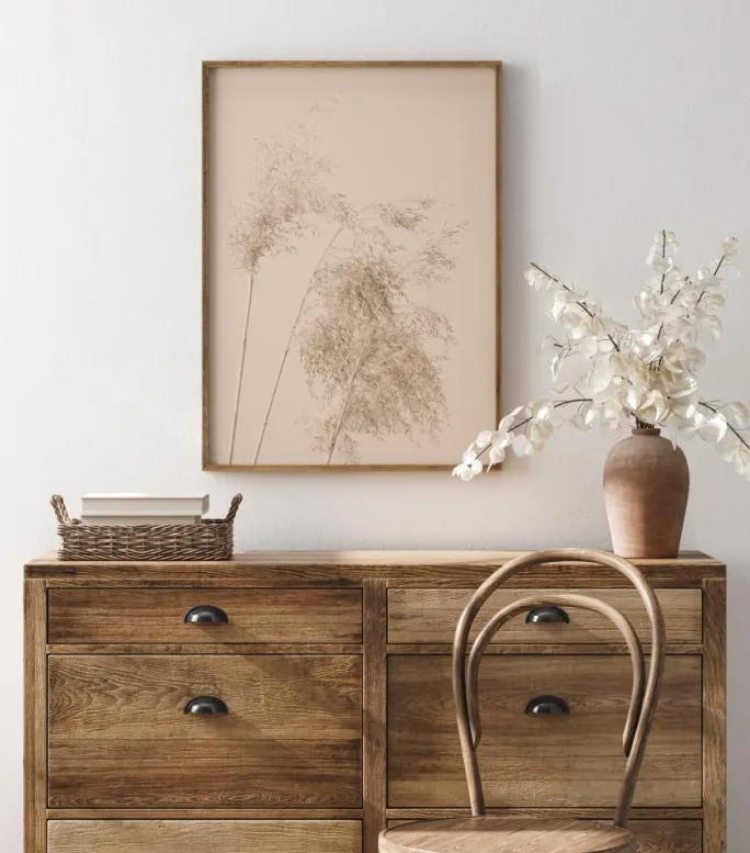 En naturplakat af rørgræs mod himlen. Græsset står højt mod den lyse pastelfarvede himmel, og du kan mærke freden og tomheden i dette naturprint.