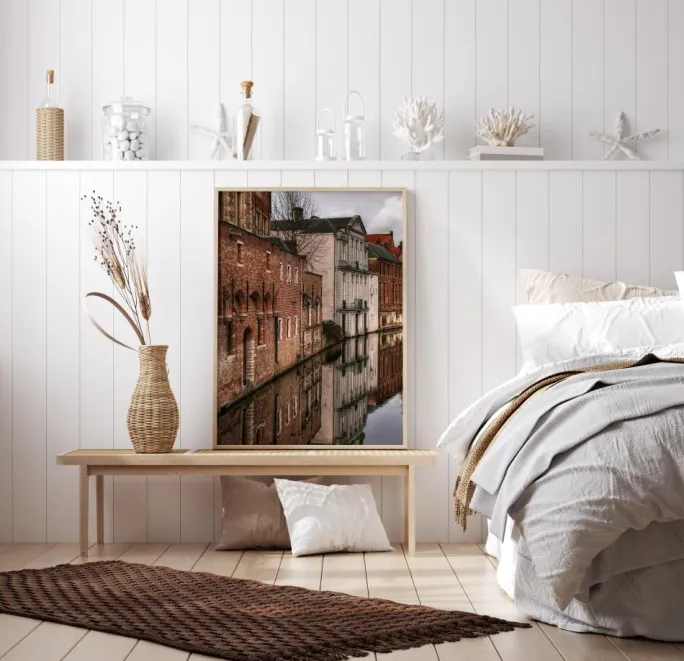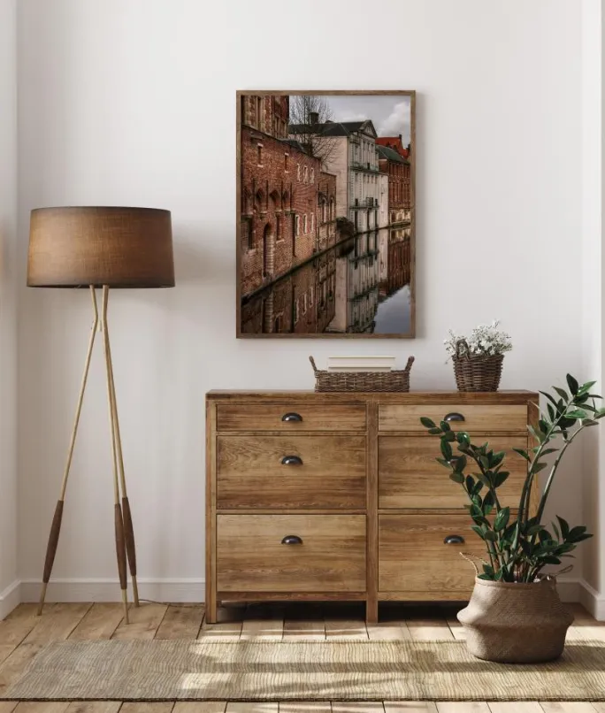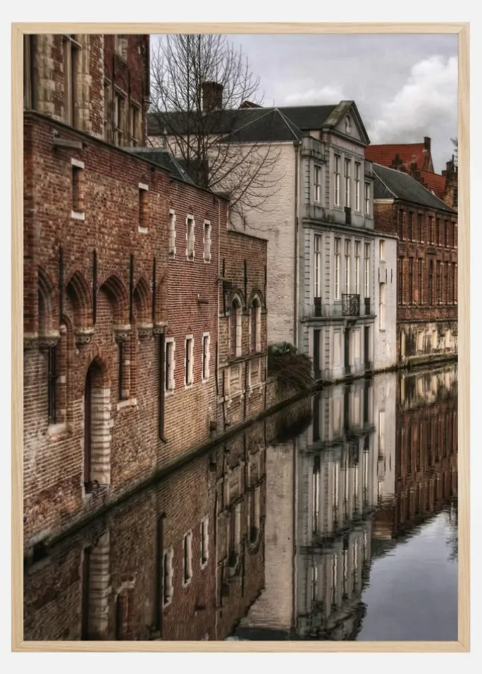 En nostalgisk plakat af rækker af gamle huse langs en flod. De enkle rustikke røde murstenshuse og deres arkitektoniske detaljer afspejles i det stille vand nedenfor. Forestil dig, at du flyder langs disse bygninger, mens du reflekterer over fortiden.