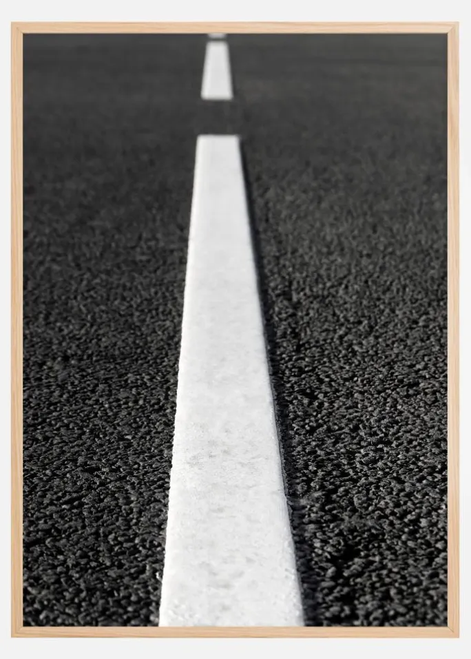 Denne kunstneriske plakat giver en ny vinkel på den klassiske vejscene ved at fokusere på en hvid linje, der strækker sig uendeligt over asfaltens sorte overflade. Den enkle komposition er både kraftfuld og meditativ, en påmindelse om rejsens natur og de stier, vi vælger i livet. Det er en perfekt indretningsdetalje for dem, der ønsker en moderne og minimalistisk æstetik i deres hjem eller kontor.
