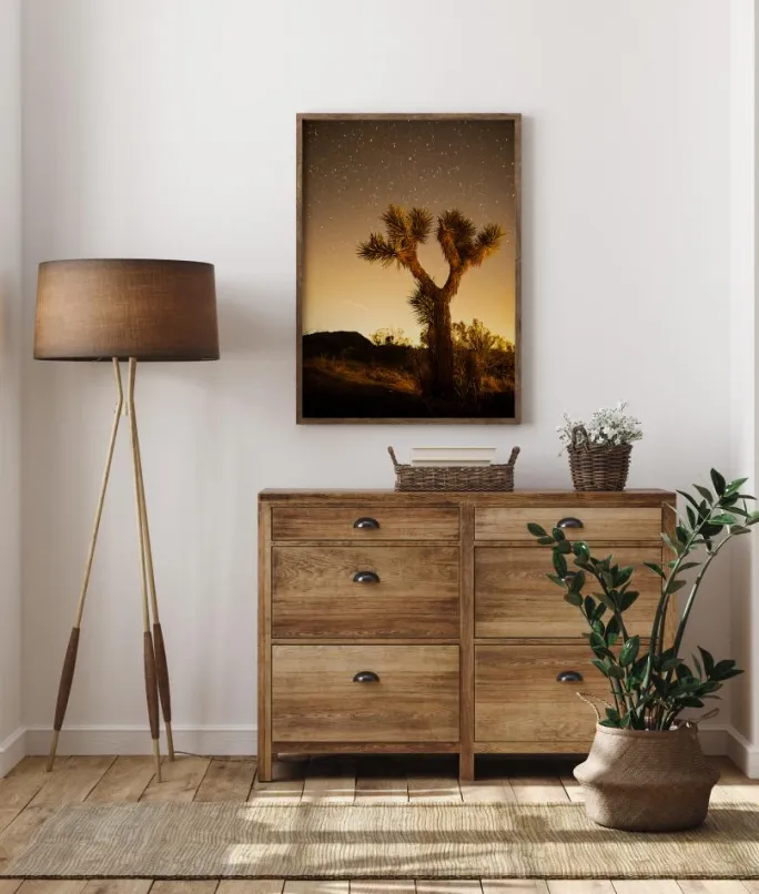 En natteplakat af en stor kaktus i ørkenen, der står højt mod en nattehimmel fuld af stjerner. Kaktussen er badet i en blød gylden glød, mens solen går ned i horisonten. Stjernerne blinker blidt over himlen på en blød, varm himmel. Nyd varmen på denne nathimmel i ørkenen.