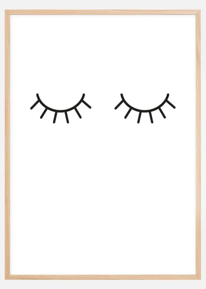 Kør på stilrent og enkelt i børneværelset med denne søde plakat! Motivet forestiller lukkede øjne med lange øjenvipper. Da den er sort-hvid, er den nem at matche med ramme og anden indretning.