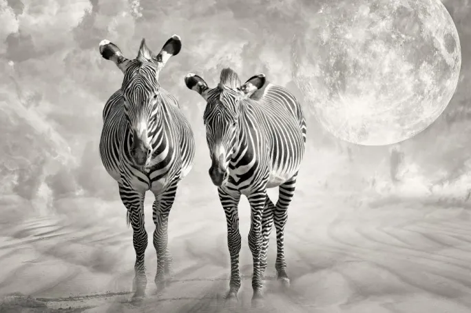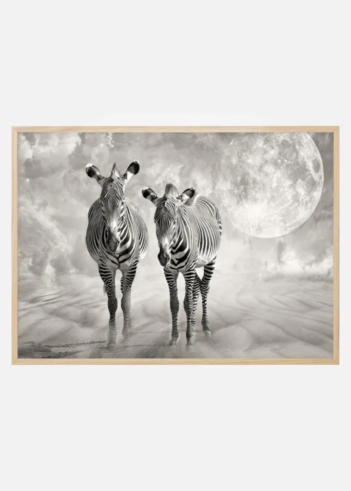 En fantasiplakat af to zebraer, der går sammen med blødt bølgende støv og en stor fuldmåne bagved. Billedet er blødt sort, hvidt og sølv, hvilket skaber en magisk effekt, som om månen kaster sit lys på disse zebraer, der er sjælevenner. Mærk vidunderet i dette æteriske print.