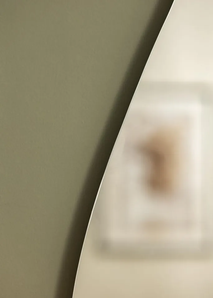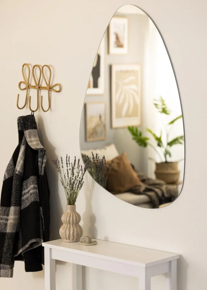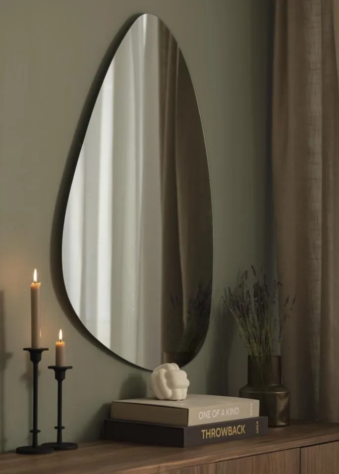 Denne spejl er perfekt for dig, der søger et elegant spejl i minimalistisk stil. Den asymmetriske form kombineres med en tynd spejlglass og kanter uden ramme, hvilket giver en meget elegant helhed. På bagsiden findes vægbeslag.