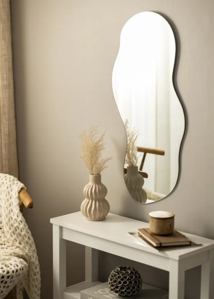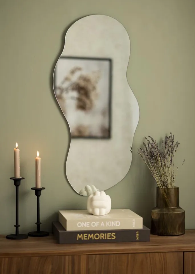 Thin Cloud er et tyndt, aflangt spejl med en unik bølgeform. Det bølgende design skaber et blødt udtryk, der matcher godt sammen med møbler med lige linjer, som borde, kommoder og bogreoler. Denne vægspejl måler 40×80 cm og kan monteres på dine vægge ved hjælp af vægbeslaget på bagsiden.