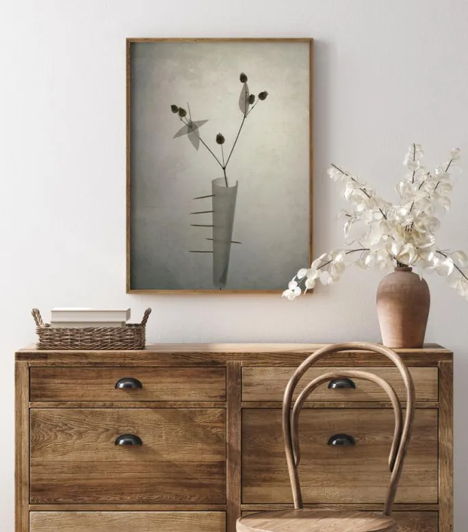 En finurlig plakat af en tynd vase med en spidsklumpet blomst indeni. Baggrunden er lysegrå med et stærkt lysglimt, der belyser denne spidse plante og skaber abstrakte former. Hvis du vil give den mere pift, kan du sætte den på en farverig væg.
