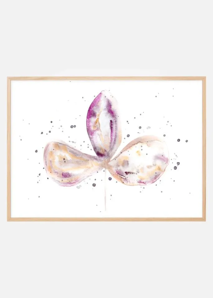 En lys plakat med tre lilla kronblade i midten af en hvid baggrund. Forskellige lilla toner skaber disse bløde, ekspansive blade. Punkter af lilla maling vælter ud fra bladene for at skabe en mere abstrakt stemning. Få farverne frem ved at hænge den op på en lilla væg.