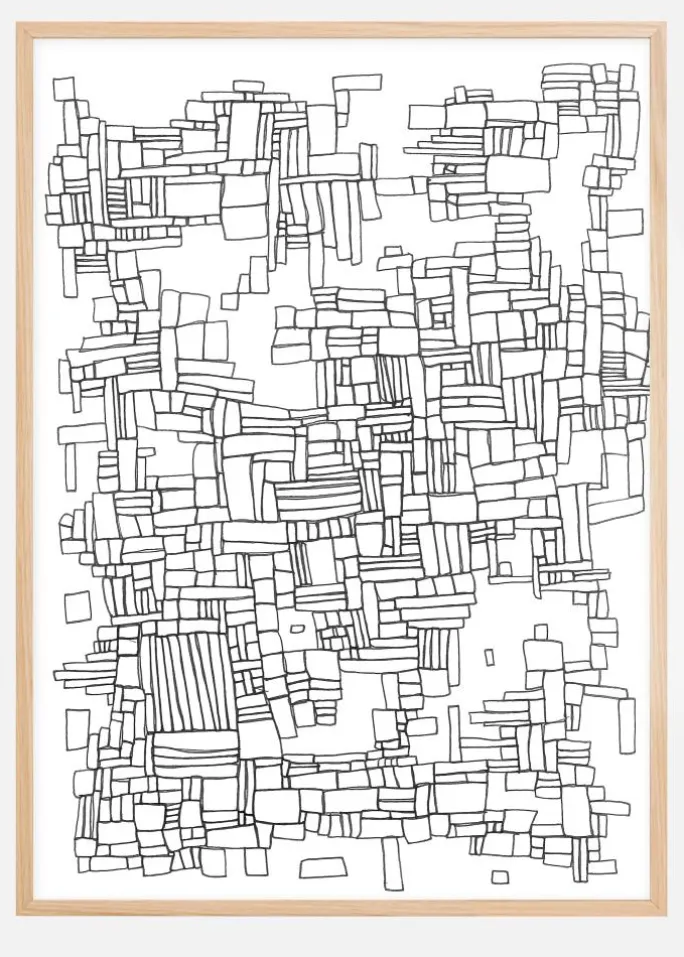 En mønsterplakat med geometriske firkanter i sorte linjer på en hvid baggrund. Hundredvis af små firkanter og rektangler kombineres for at skabe et mærkeligt mønster på tværs af dette stykke. Stir på den og prøv at finde mønstrene og formerne indeni for at få en overbevisende tilføjelse til dit hjem.