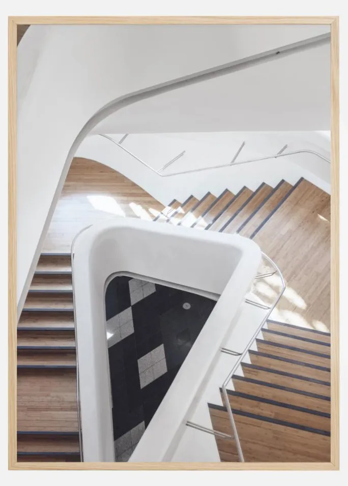 En interiørplakat af et sæt trapper i en trekantform. Trinene er brune med væggene og gelænderet i hvidt med forkromede gelændere. De svinger nedad og rundt til et sort og hvidt flisegulv nedenunder. Kig ned fra oven i dette Escher-lignende billede og forestil dig, at du går over disse smukke trapper.