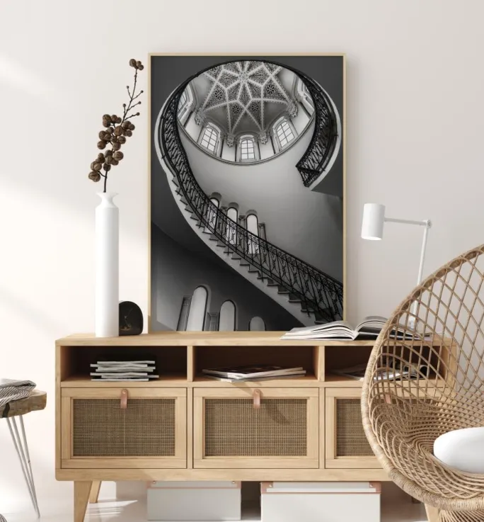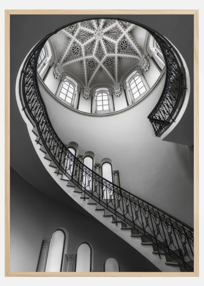 En indviklet plakat af en bygnings indre. En vindeltrappe med indviklede smedejernsbannister snor sig op mod loftet. Dit øje drages op til kuplen med et fantastisk gittermønster og lyse vinduer, hvor lyset skinner ind. Elegance og detaljer kombineres i dette sort-hvide billede.