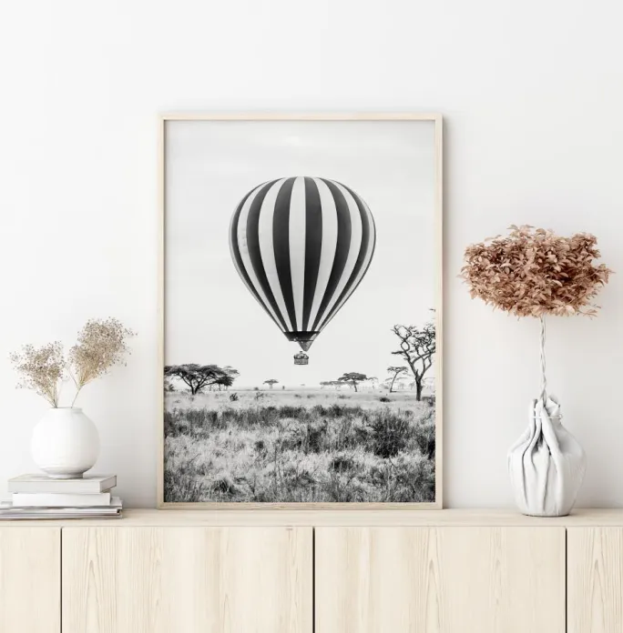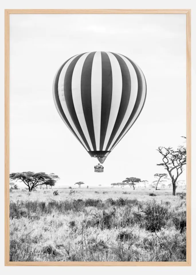 En fredfyldt sort/hvid plakat af en varmluftballon, der svæver lavt over et græslandskab. Den stribede ballon giver et dramatisk udtryk midt i de store afrikanske sletter. Græsset breder sig i alle retninger, og akacietræer flankerer ballonen for at skabe en fornemmelse af dybde. En cremefarvet væg vil tilføje varme.